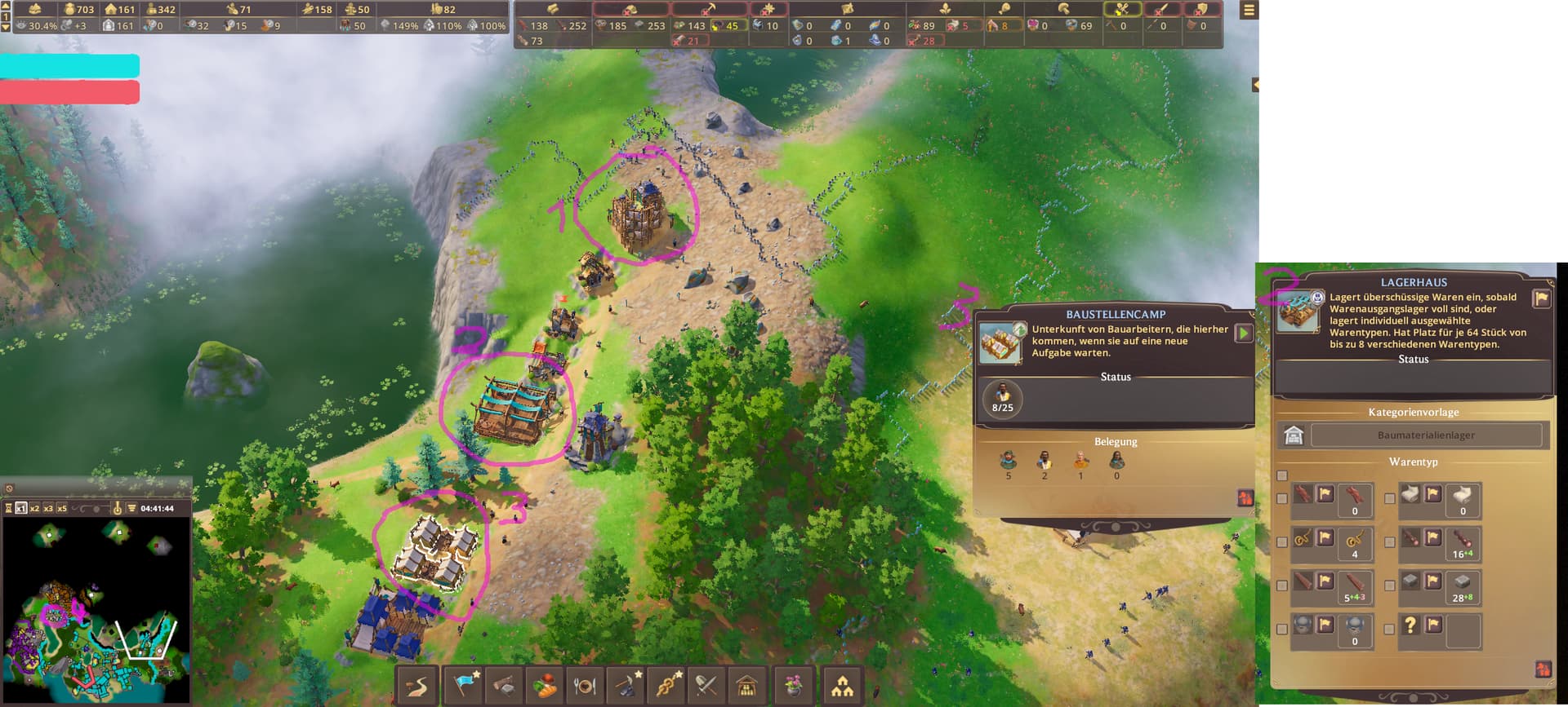 Der zugeteilte Bauarbeiter beschloss einen Stein von 4 (siehe Minimap) zu holen. Das hat den Bau natuerlich etwas zurueckgeworfen, weil bis der dort war, war schon lange wieder ein Scav am Wachturm der erst erschlagen werden musste, also Auftrag abgebrochen. Das ging einige Male so. Ich habe leider nicht gesehen wann und wie der Wachturm fertiggstellt wurde, aber fast eine Stunde lang beschlossen die Arbeiter immer Steine direkt von einem entfernten Steinbruch zu holen anstatt die aus dem Lager zu nehmen.
